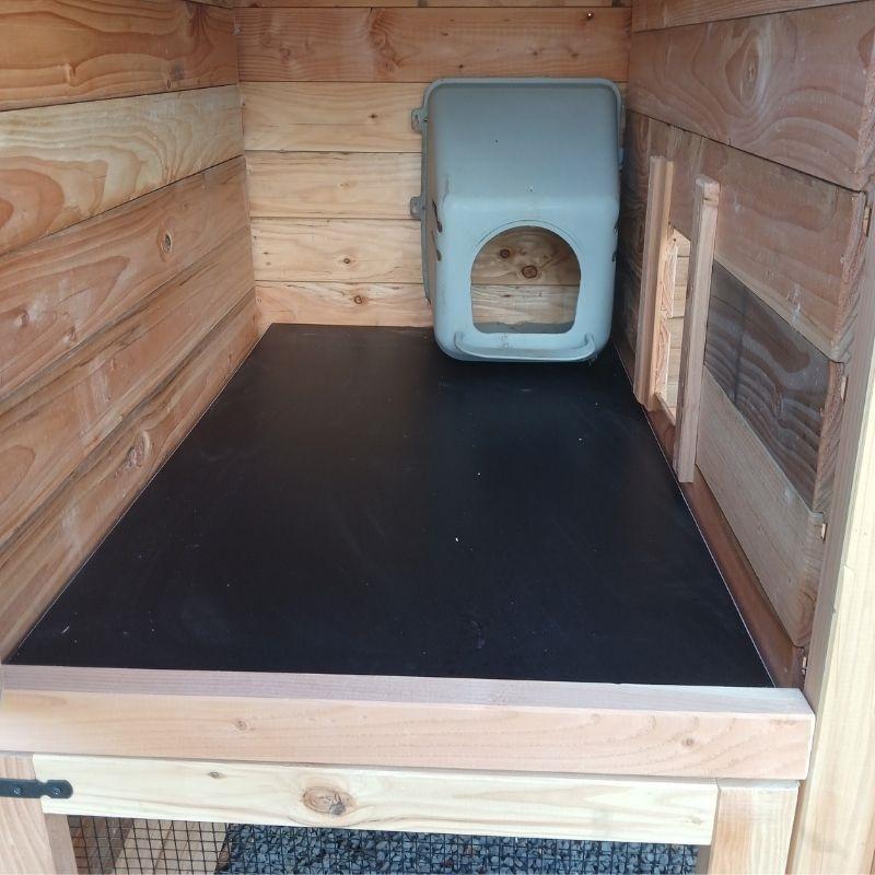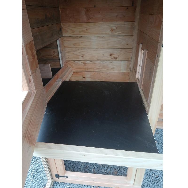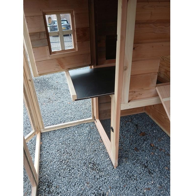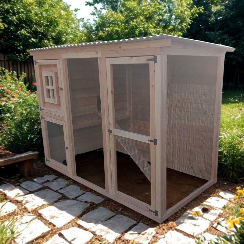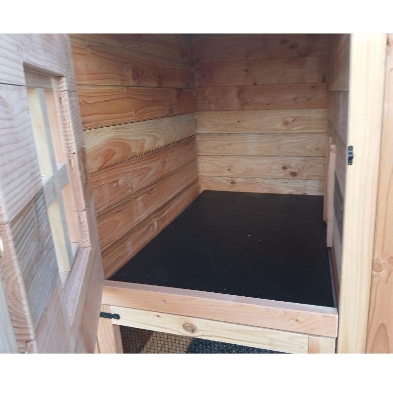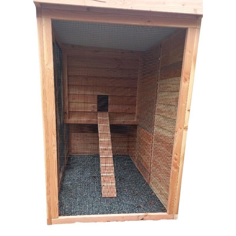 Douglas kippenhok van hoge kwaliteit. Het kippenhok of konijnenhok is gemonteerd uit kant en klare panelen van 85x180cm aan de voor en achterzijde, en panelen van 120x180cm aan de zijkanten en binnenzijde. Omdat het kippenhok opgebouwd is uit complete panelen kan hij makelijk in een andere samenstelling of onbeperkt groter opgebouwd worden. De goedkoopste optie is zonder daklijst maar het hok kan uiteraard ook met daklijsten besteld worden. Ook kunnen er kunststof funderingregels van 40x40mm meebesteld worden. Op de kunststof regels kunnen de panelen geschroeft worden, waardoor u houtrot aan de onderkant van het kippenhok voorkomt.